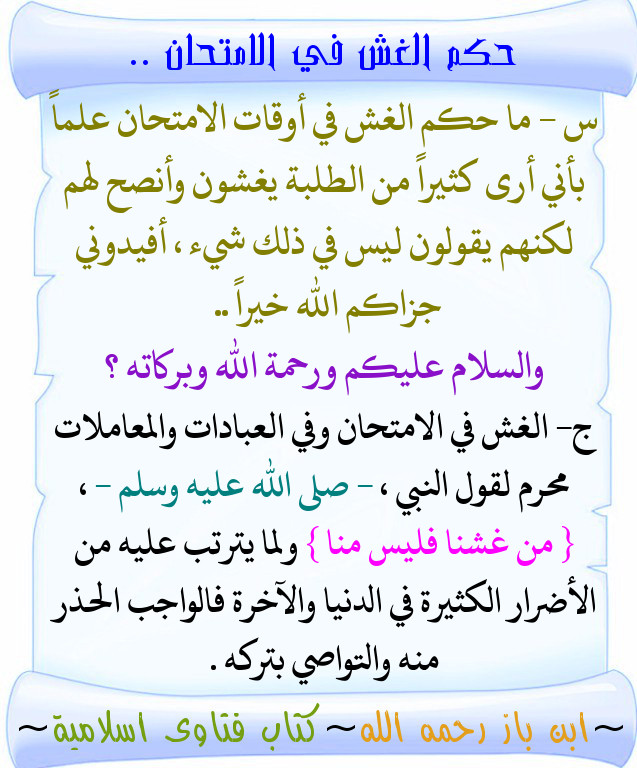 حكم الغش في الاختبارات الإلكترونية. حكم الغش في الامتحانات قال الشيخ عبد العزيز بن باز. حكم الغش في الاختبارات. ابدأ الآن بوضع اختباراتك وواجباتك على الانترنت وسوف يقوم النظام الآلي للموقع. من غشنا فليس منا.