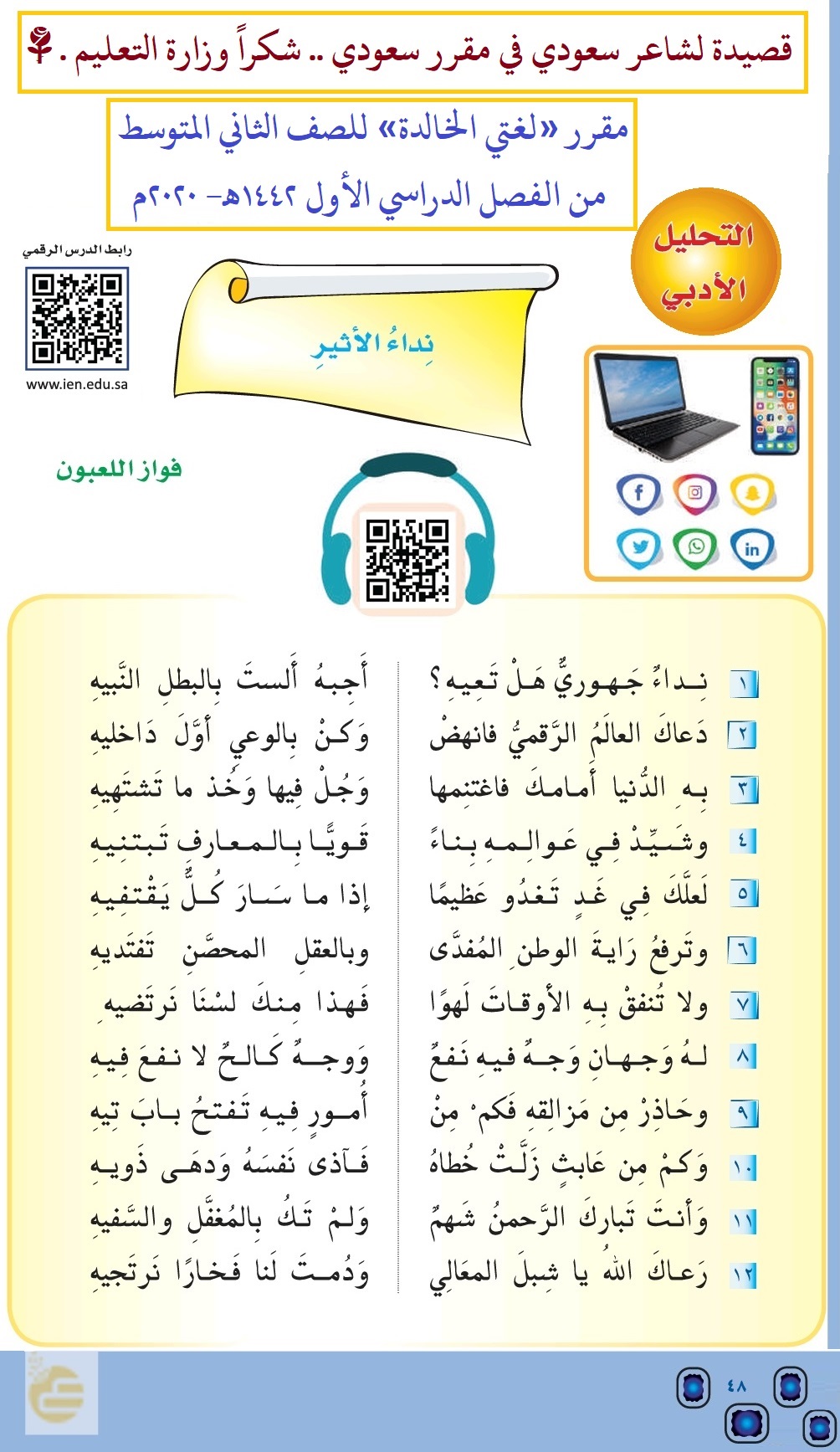 نص نداء الأثير للصف الثاني المتوسط ١٤٤٢ ف١ للشاعر الدكتور فواز اللعبون Youtube