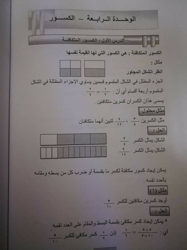 شرح وإجابات الوحدة الرابعة الكسور لمادة الرياضيات للصف الرابع الفصل الأول منتديات صقر الجنوب